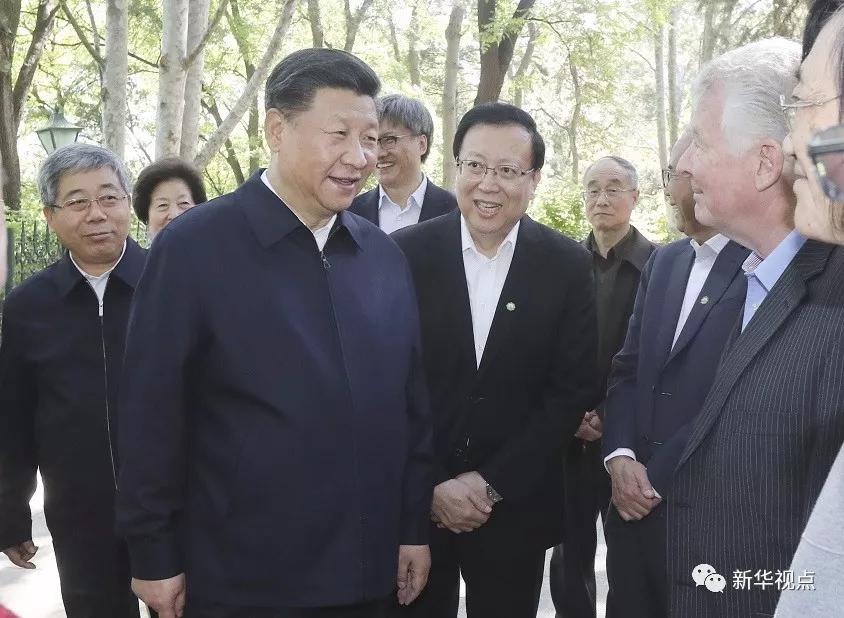 這是習(xí)近平在北京大學(xué)臨湖軒北側(cè)的小庭院看望部分資深教授和中青年教師代表,并同他們親切交談。新華社發(fā)(盛佳鵬 攝)