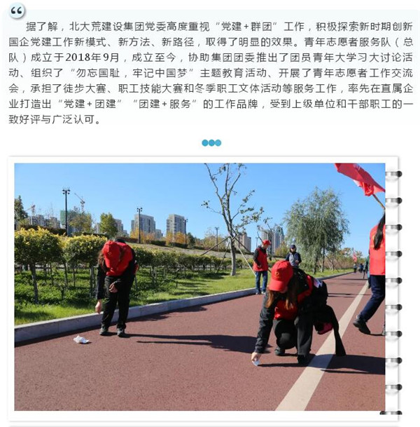 據(jù)了解,北大荒建設(shè)集團黨委高度重視“黨建+群團”工作,積極探索新時期創(chuàng)新國企黨建工作新模式、新方法、新路徑,取得了明顯的效果。青年志愿者服務(wù)隊(總隊)成立于2018年9月,成立至今,協(xié)助集團團委推出了團員青年大學(xué)習(xí)大討論活動、組織了“勿忘國恥,牢記中國夢”主題教育活動、開展了青年志愿者工作交流會,承擔了徒步大賽、職工技能大賽和冬季職工文體活動等服務(wù)工作,率先在直屬企業(yè)打造出“黨建+團建”“團建+服務(wù)”的工作品牌,受到上級單位和干部職工的一致好評與廣泛認可。