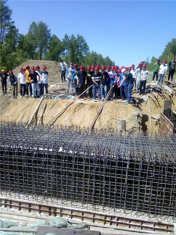 隨后,項目部人員帶領(lǐng)大家來到了施工現(xiàn)場,進入現(xiàn)場工作人員要求每位學(xué)生必須佩戴好安全帽,不要靠近臨邊防護,注意腳下等各項安全注意事項。項目辦工程部長及總工程師分別帶領(lǐng)學(xué)生們學(xué)習(xí)了橋梁下部結(jié)構(gòu)、橋涵鋼筋綁扎、涵洞基坑開挖、路基填筑等施工工藝和方法,學(xué)生們認真聆聽,將講解的內(nèi)容抄寫在隨身攜帶的筆記本上或拍照留存,大學(xué)生們的求知欲很強,不時地向工作人員請教,工作人員耐心詳盡的為學(xué)生們一一解答。