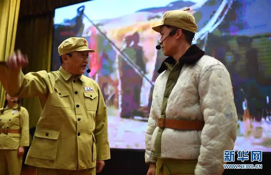 白繼紅(前左)在青海西寧舉行的“青藏公路之父慕生忠開路精神”黨課上扮演慕生忠(3月20日攝)。新華社 記者 張宏祥 攝