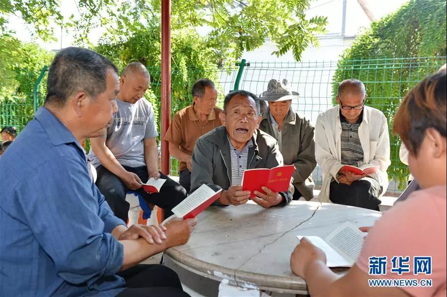 河北深州市魏家橋鎮(zhèn)孟家村老黨員孟凡濤(中)在“胡同黨校”朗讀黨章(2016年6月15日攝)。新華社記者 牟宇 攝