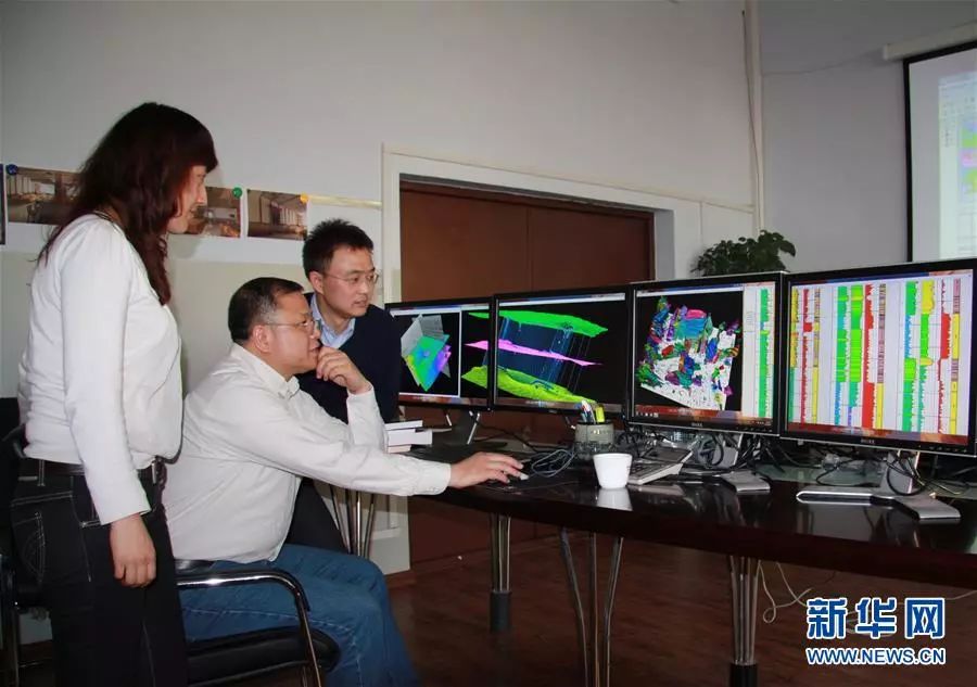 黃大年(中)帶領(lǐng)科研團(tuán)隊成員研究問題(2010年11月22日攝)。新華社發(fā)