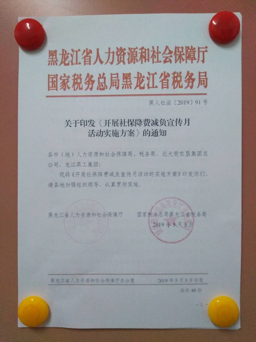 為“完善社保制度,保障職工權(quán)益”,龍墾公司緊緊圍繞不折不扣將中央降費(fèi)減負(fù)政策落實(shí)到位的工作目標(biāo),積極響應(yīng)黑龍江省人力資源和社會(huì)保障廳《關(guān)于降低全省城鎮(zhèn)職工基本養(yǎng)老保險(xiǎn)和失業(yè)保險(xiǎn)費(fèi)率的通知》 ,全面落實(shí)開(kāi)展社保降費(fèi)減負(fù)宣傳活動(dòng)。
