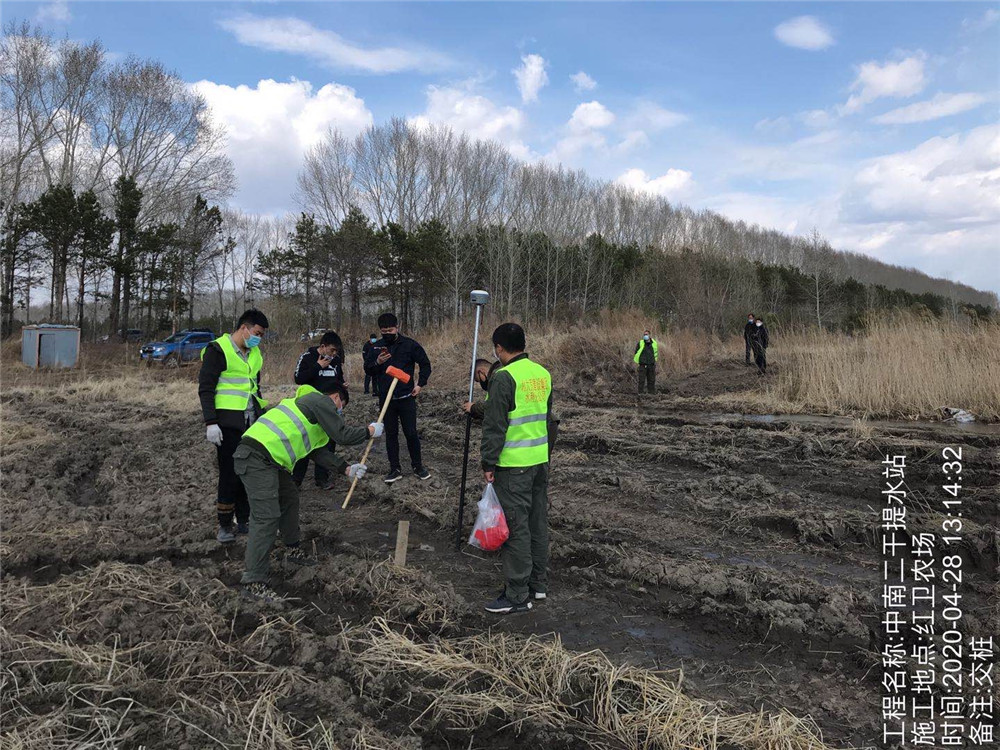 4月28日,黑龍江農(nóng)墾建三江管理局青龍山灌區(qū)管理站總工程師宋協(xié)勝、黑龍江農(nóng)墾勘測(cè)設(shè)計(jì)研究院劉萬(wàn)金、黑龍江省北方水利水電工程監(jiān)理有限公司總監(jiān)劉洋同項(xiàng)目部進(jìn)行非正式交接樁,確定中南二干提水站、獨(dú)立二支渠灌溉站的軸線及施工占地紅線位置,提前籌劃施工。