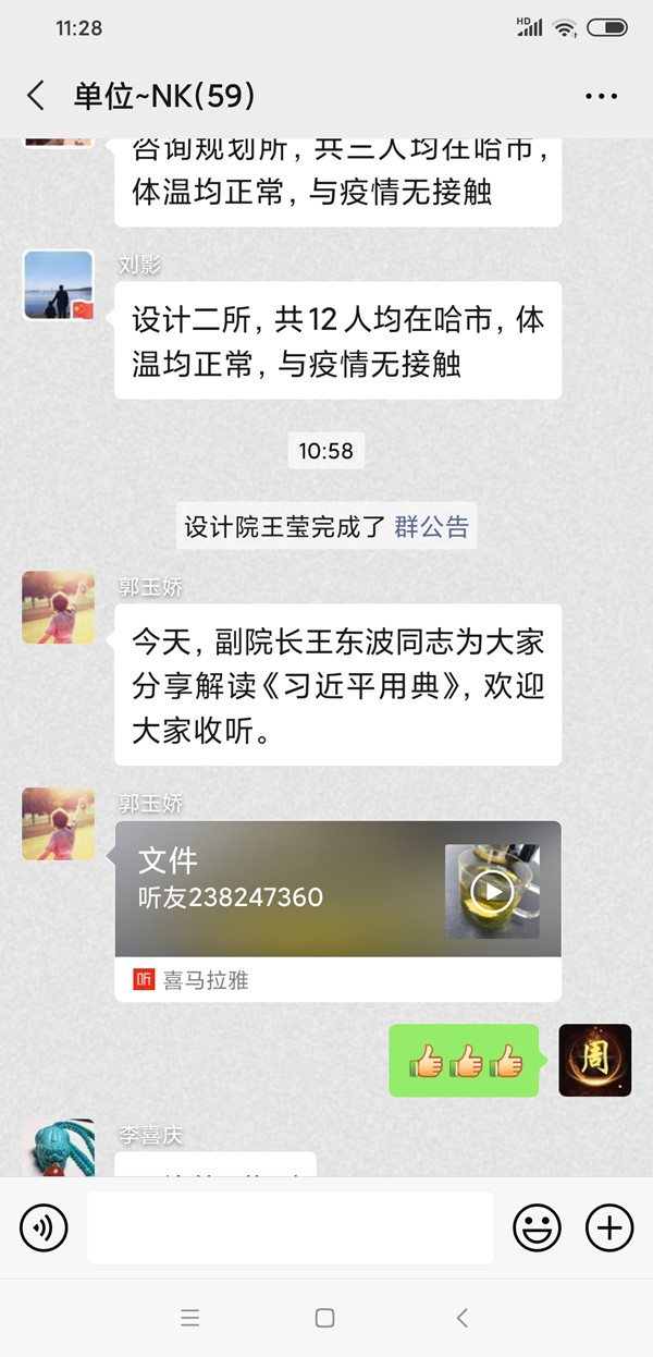 活動(dòng)得到了設(shè)計(jì)院領(lǐng)導(dǎo)的高度重視,率先發(fā)揮以上率下作用,大力支持,積極參與,先后為大家分享了《焦裕祿的入黨故事》《華羅庚70入黨終不悔》《彭德懷同志在革命低潮時(shí)毅然加入中國(guó)共產(chǎn)黨》、《我們的時(shí)代、我們的奮斗》、解讀《習(xí)近平用典——士不可以不弘毅,任重而道遠(yuǎn)》等文章,200余人通過(guò)音頻開(kāi)展線(xiàn)上政治理論學(xué)習(xí)。