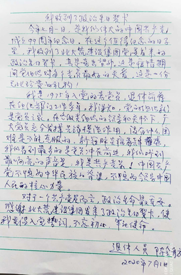 “今年七月一日,是我們偉大的中國共產(chǎn)黨成立99周年紀(jì)念日。在這個(gè)值得紀(jì)念的日子里,我收到了北大荒建設(shè)集團(tuán)黨委發(fā)來的政治生日賀卡,真是喜出望外。這是疫情期間黨組織對每個(gè)黨員最好的關(guān)愛。這是一份無比珍貴的禮物!”這是北大荒建設(shè)集團(tuán)退休老黨員陳金舫的肺腑之言。