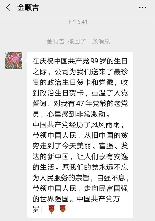 老黨員金順吉收到賀卡,激動地像個(gè)孩子,又唱又跳,看著自己的入黨時(shí)間,計(jì)算出自己已47年的黨齡,興奮地和自己已有45年黨齡的老伴相偎在一起,和賀卡合影留念。她激動地說:“在慶祝中國共產(chǎn)黨99歲的生日之際,公司黨委為我們送來了最珍貴的政治生日賀卡和黨徽,收到政治生日賀卡,重溫了入黨誓詞,對我有47年黨齡的老黨員,心里感到非常激動。作為一名共產(chǎn)黨員,我無尚光榮和自豪?!?/span>