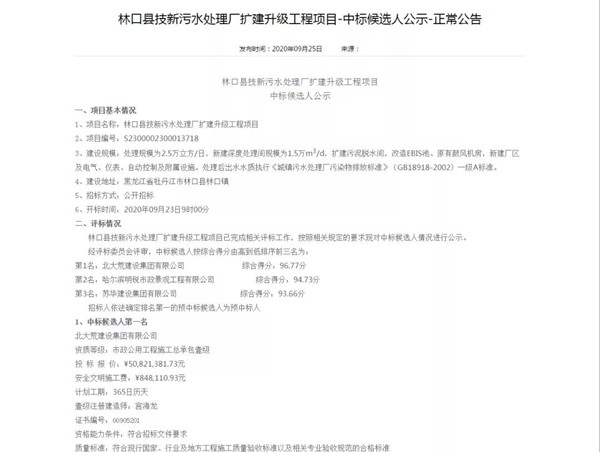 9月25日,黑龍江公共資源交易網(wǎng)發(fā)布《林口縣技新污水處理廠擴(kuò)建升級工程項(xiàng)目中標(biāo)公示》,市政分公司成功中標(biāo)林口縣技新污水處理廠擴(kuò)建升級工程項(xiàng)目。該項(xiàng)目位于牡丹江市林口縣林口鎮(zhèn),中標(biāo)合同額為5082.38萬元。該項(xiàng)目建成后,將有效滿足當(dāng)?shù)亟窈笪鬯幚硇枨螅玫母纳飘?dāng)?shù)厣鷳B(tài)環(huán)境和居民居住環(huán)境。